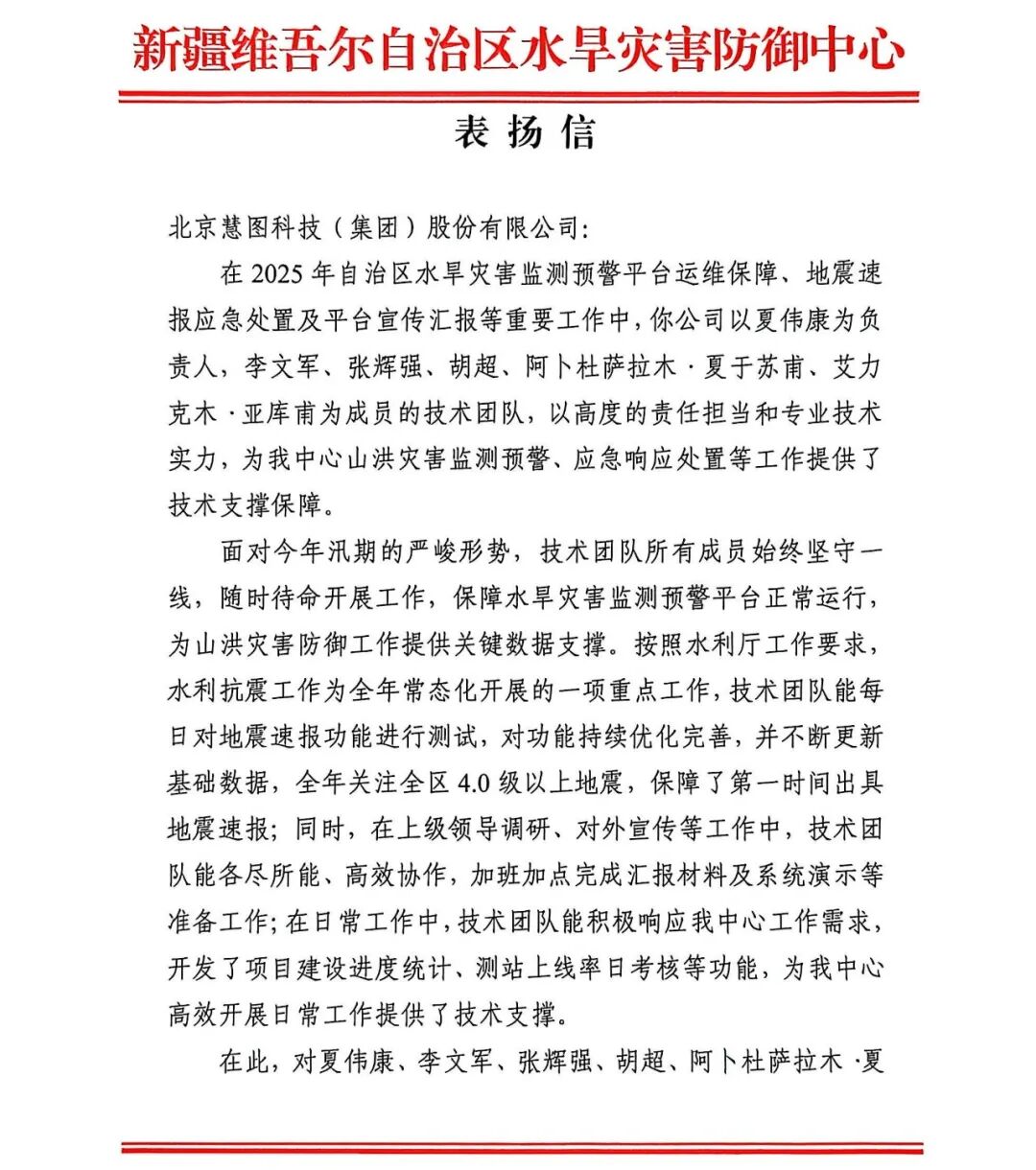 从汛期暴雨防御、地震速报,到平台迭代升级、一线需求响应,扎根边疆的技术人以专业为刃、责任为盾,筑牢水利防灾“安全防线”,彰显慧图科技硬核实力。