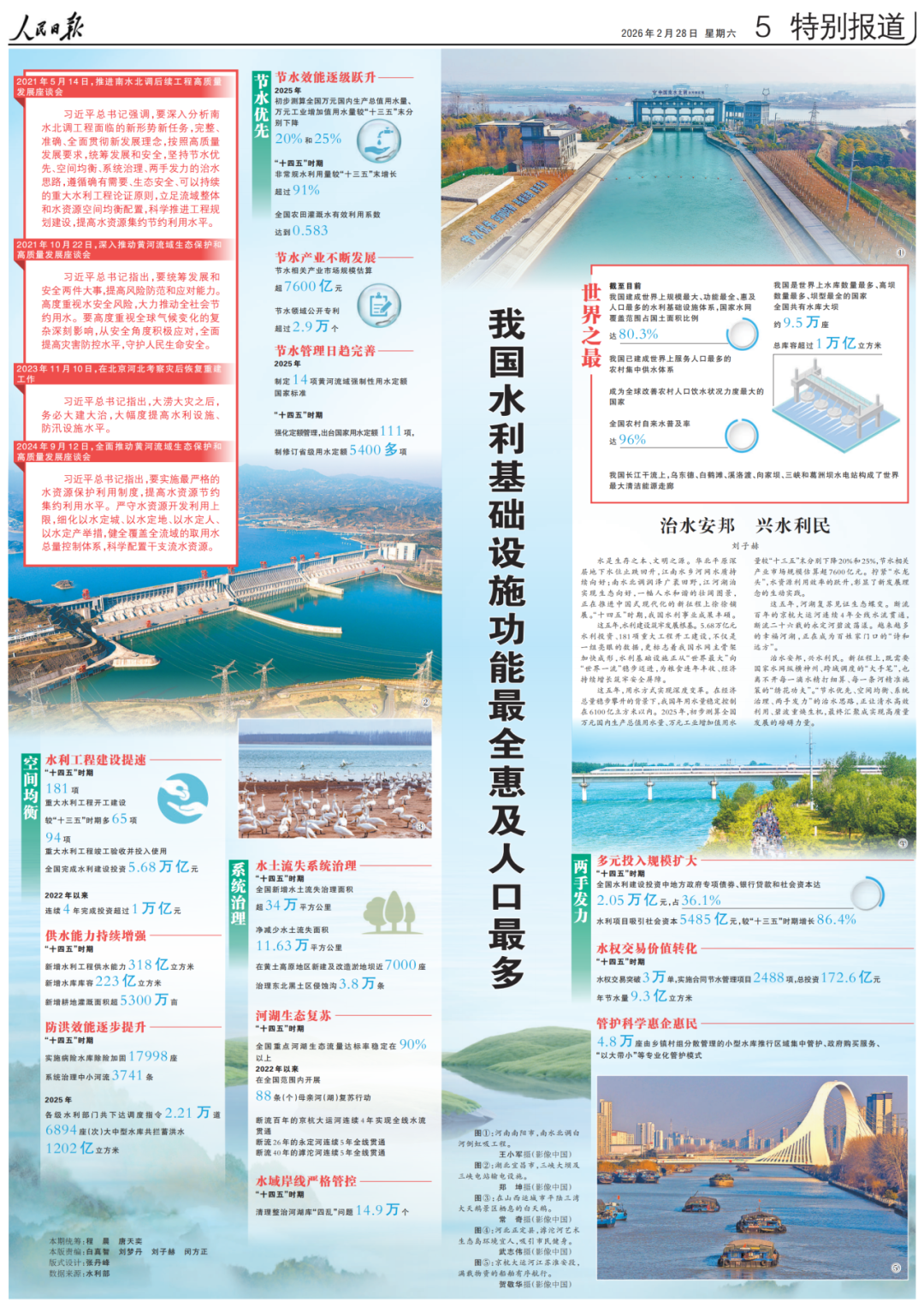 全国“一盘棋”,锚定推动水利高质量发展、保障我国水安全目标,“十四五”时期完成水利建设投资5.68万亿元,2022年以来连续4年完成年投资超过1万亿元。截至目前,我国建成世界上规模最大、功能最全、惠及人口最多的水利基础设施体系。