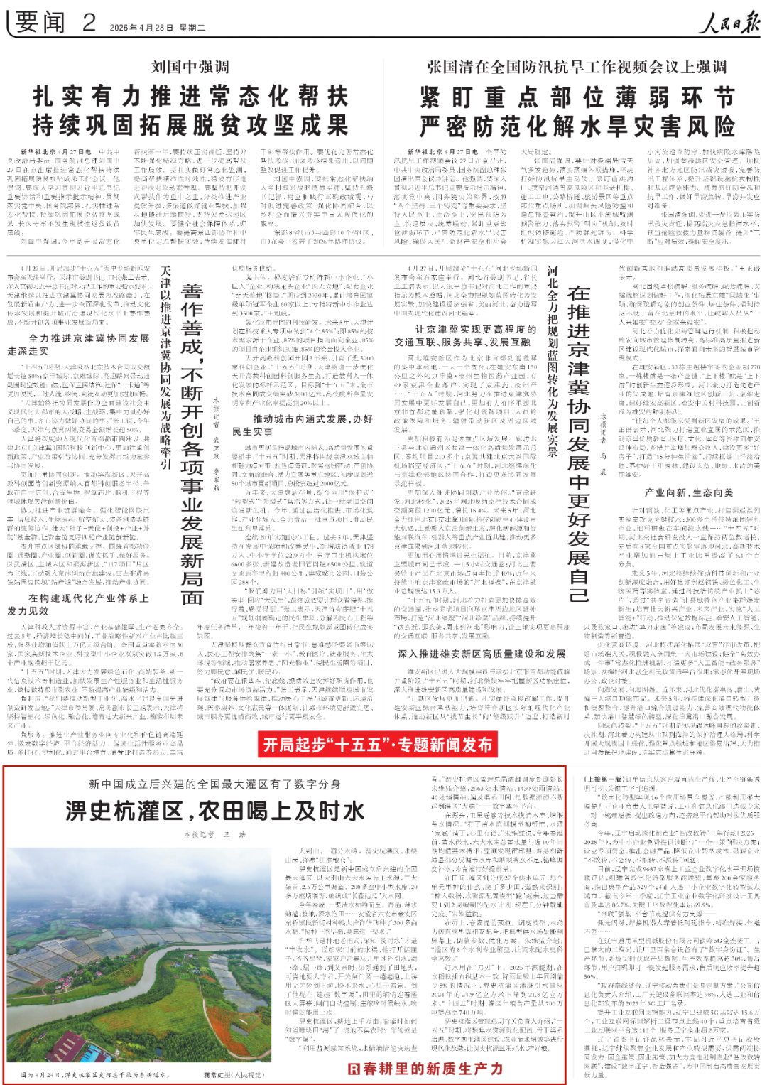 今日(4月28日)发行的《人民日报》,在要闻版,以《春耕里的新质生产力——淠史杭灌区,农田喝上及时水》为题,报道了这个新中国成立后兴建的全国最大灌区,通过灌区“大脑”——数字孪生平台,及遍及渠系田间的2063处水情站、1430处雨情站、40处墒情站,实现水情墒情的实时监测和调水配水的科学高效。