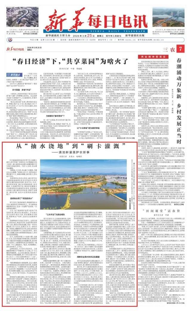 新华社记专题采访了大禹集团滇池流域深化农业水价综合改革及现代化灌区项目,评价该项目便利了农户田间供水、重塑了农业用水秩序,改善了水质与景观,实现了“政府节水、农民增收、农业增产、企业增效”。