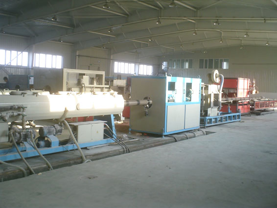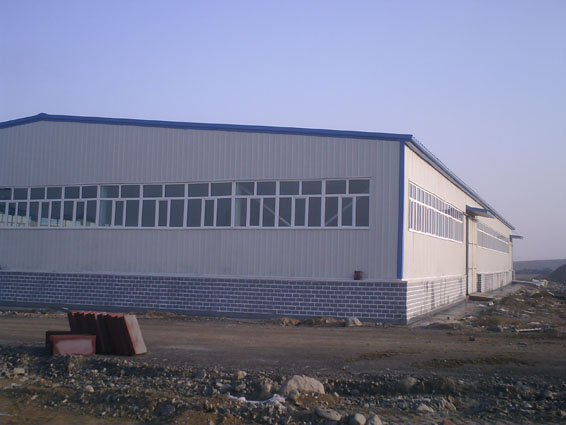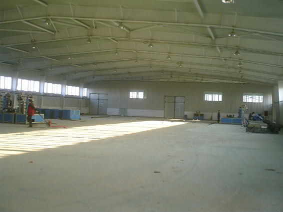 2、PVC车间—此车间钢柱、钢屋架吊装完成,屋面檩条、墙面檩条及所有拉条安装完成,门柱、门梁、窗柱安装完毕,屋面及墙面彩板安装完毕,室内工艺地沟粉刷完成,檐口封板安装完成,砌筑墙体室内外抹灰完成。室内喷防火涂料完成。室内耐磨地面施工完成。室外散水回填完成。车间内电气设备安装完成、卫生间墙砖的粘贴完成;室内消防管道、电气设备、循环水管道安装完成;车间窗户玻璃安装完成。暖气设备安装完成。室外维护墙涂料粉刷完成。室内配电柜安装完成。4条生产线正在安装调试中。