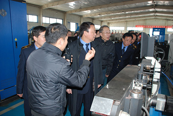 酒泉市农技中心主任闫海基一行在大禹节水公司了解滴灌管(带)生产线工作原理