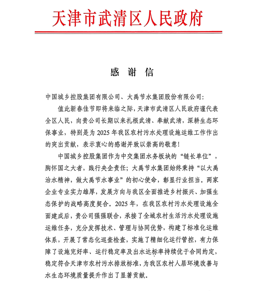 在新春佳节来临之际,武清区人民政府代表全区人民,对大禹集团长期以来扎根武清、奉献武清、深耕生态环保事业,特别是在2025年农村污水处理设施运维工作中作出的突出贡献,致以诚挚感谢与崇高敬意。