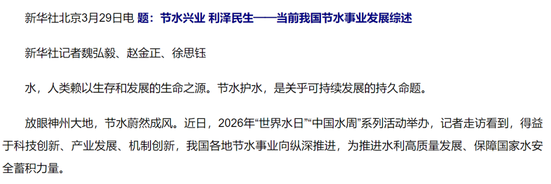 放眼神州大地,节水蔚然成风。近日,2026年“世界水日”“中国水周”系列活动举办,记者走访看到,得益于科技创新、产业发展、机制创新,我国各地节水事业向纵深推进,为推进水利高质量发展、保障国家水安全蓄积力量。